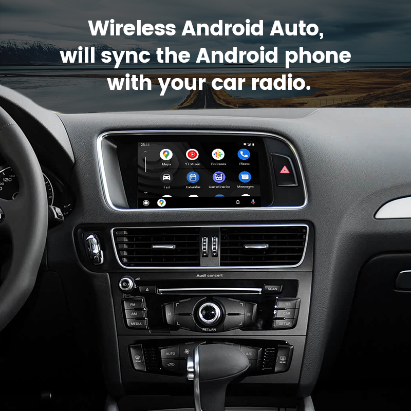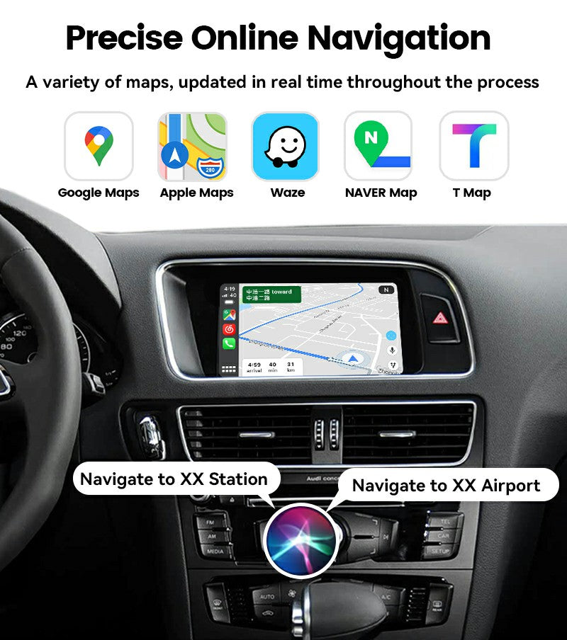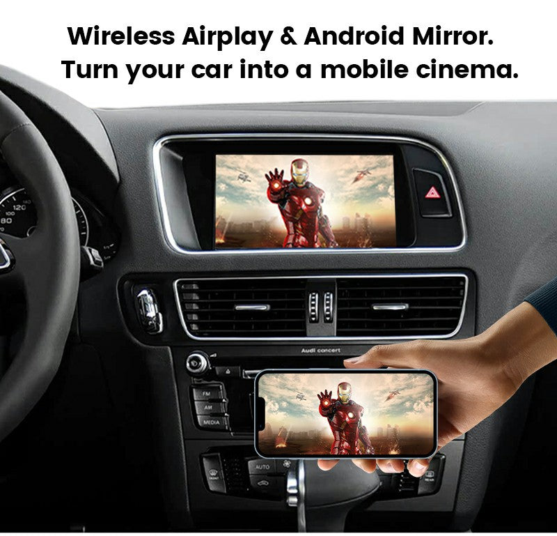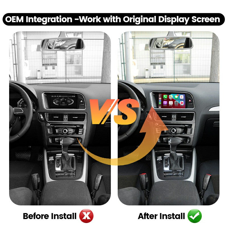 Upgrade your 2010-2016 years Audi A4, A5, Q5 models without MMI system with our Wireless CarPlay & Android Auto Interface。 This module seamlessly integrates modern smartphone features into your factory screen, providing both wired and wireless connectivity while fully retaining the use of your original steering wheel controls 。