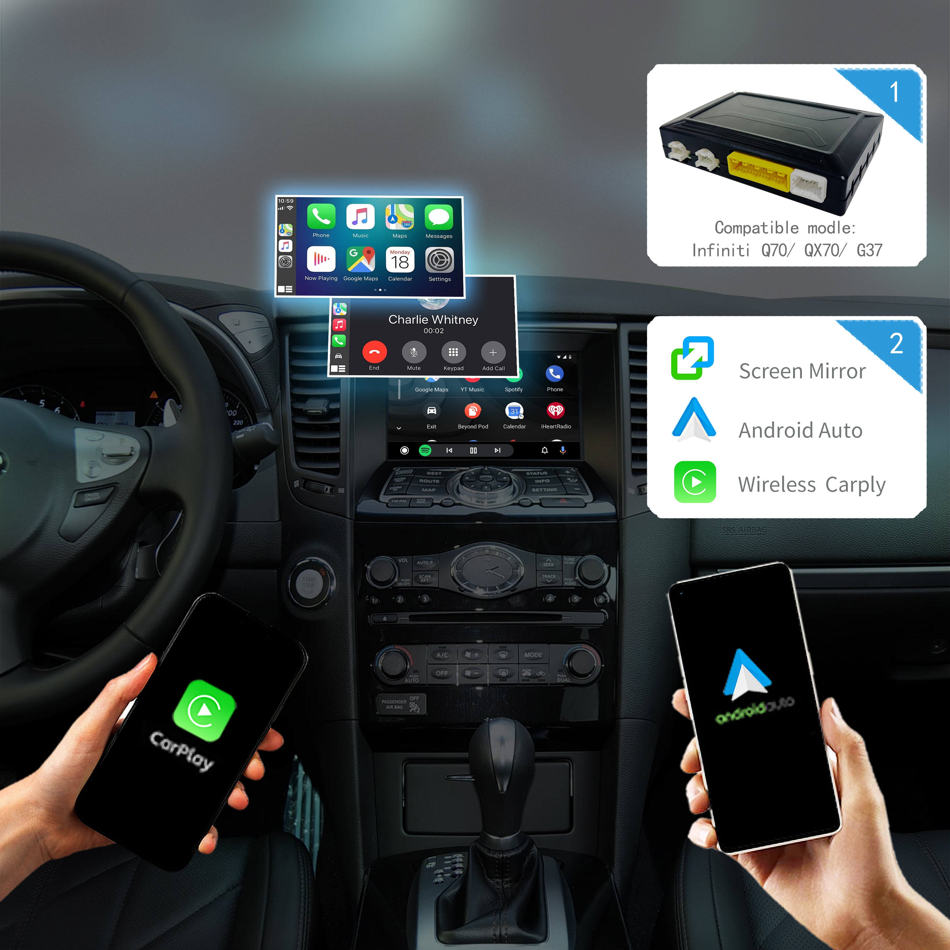 Unlock advanced smartphone integration for your 2012-2019 Infiniti QX70, Q70, or G37 with our Wireless CarPlay & Android Auto Interface. This module is engineered to seamlessly integrate modern smartphone features directly into your factory infotainment screen, providing a cutting-edge connected experience while fully retaining your original vehicle's controls and system functionalities.