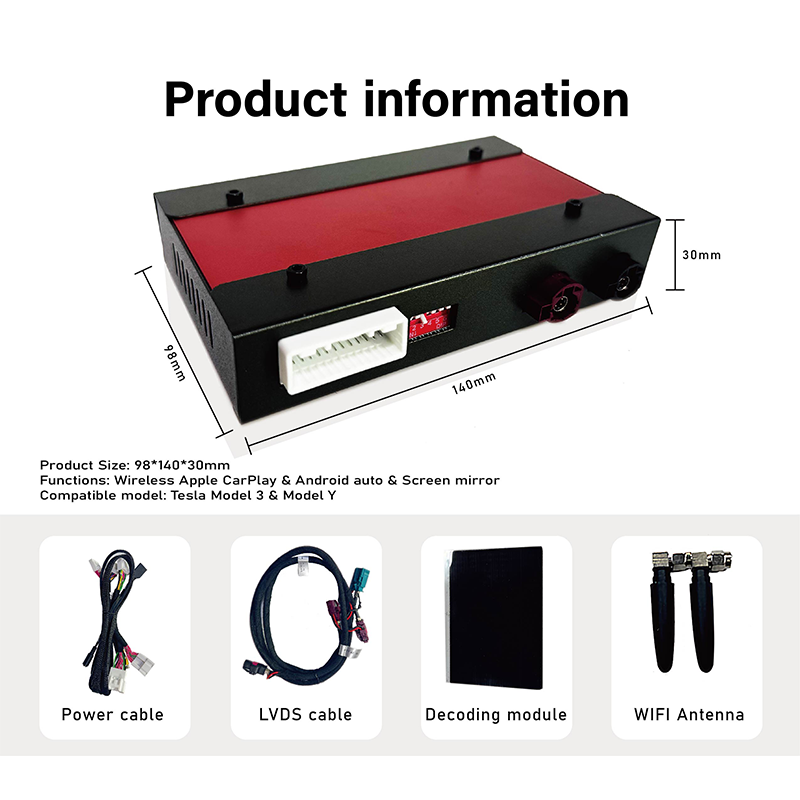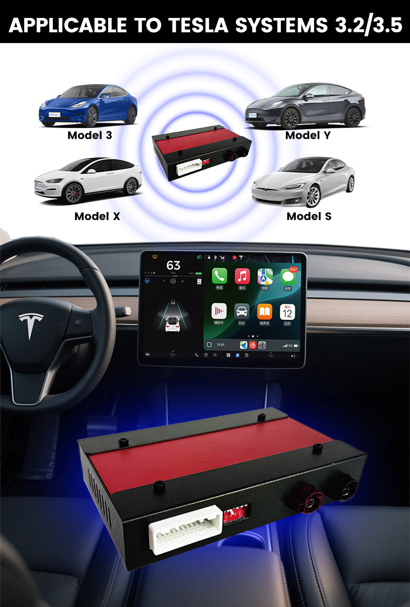 This CarPlay Android Auto module is designed to meet the standards of international markets including Europe, North America, and Asia-Pacific. Perfect for car accessory dealers, audio-video retrofiters, and Tesla aftermarket installers.